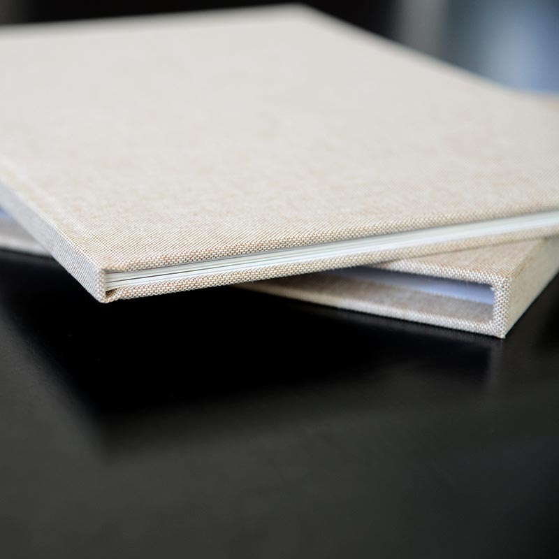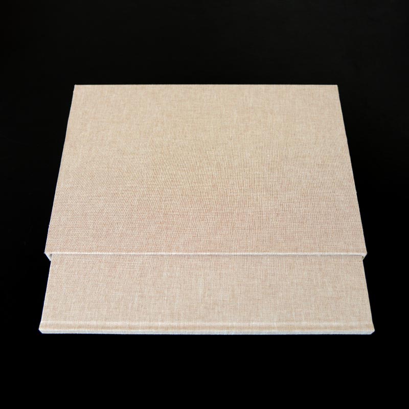 V ponudbo smo vključili tudi dekorativno embalažo, ki je oblikovana in krojena po meri izbrane knjige. Ročno izdelana kartonasta Slip box škatla je prevlečena z enakimi materiali kot platnica. Slip box je lahko v celoti potiskan tudi z vašim oblikovanjem. Na volje je za L (large) in M (medium) knjigo.