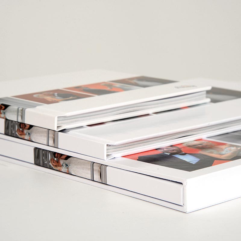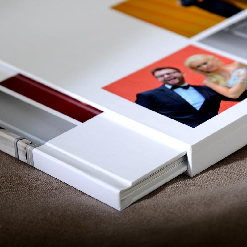 V ponudbo smo vključili tudi dekorativno embalažo, ki je oblikovana in krojena po meri izbrane knjige. Ročno izdelana kartonasta Slip box škatla je prevlečena z enakimi materiali kot platnica. Slip box je lahko v celoti potiskan tudi z vašim oblikovanjem. Na volje je za L (large) in M (medium) knjigo.