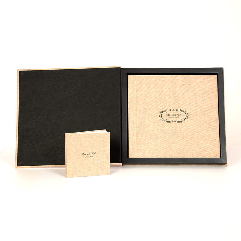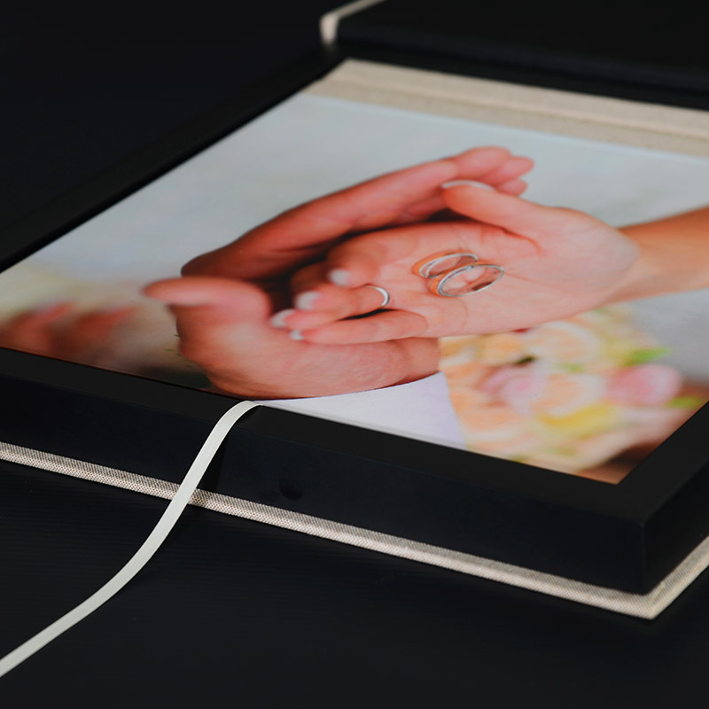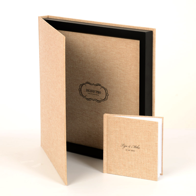 Kombinacija naravnega lesa, izbranega knjigoveškega platna ali poljubno potiskane platnice sestavlja elegantno zasnovano dekorativno škatlo Boutique box. Knjigi prilagojen lesen okvir je na voljo v naravni, beli in črni barvi.